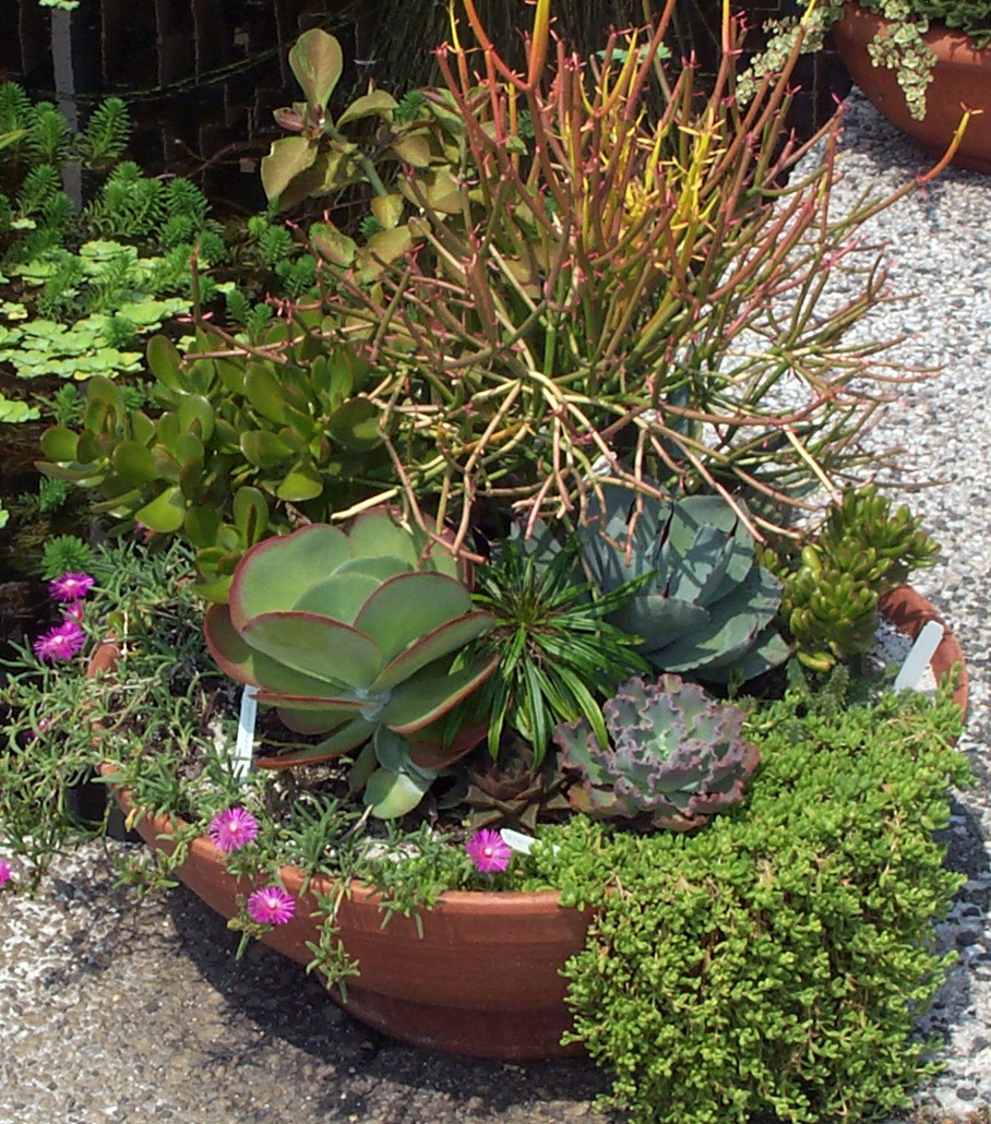 Another helpful hint is to group your containers, especially if you have many small ones. By grouping, you achieve a bigger impact and it is far easier to take care of them in one bunch. If you do drip irrigation, grouping is essential as you use less tubing and you can hide the tubing in the adjacent pots.