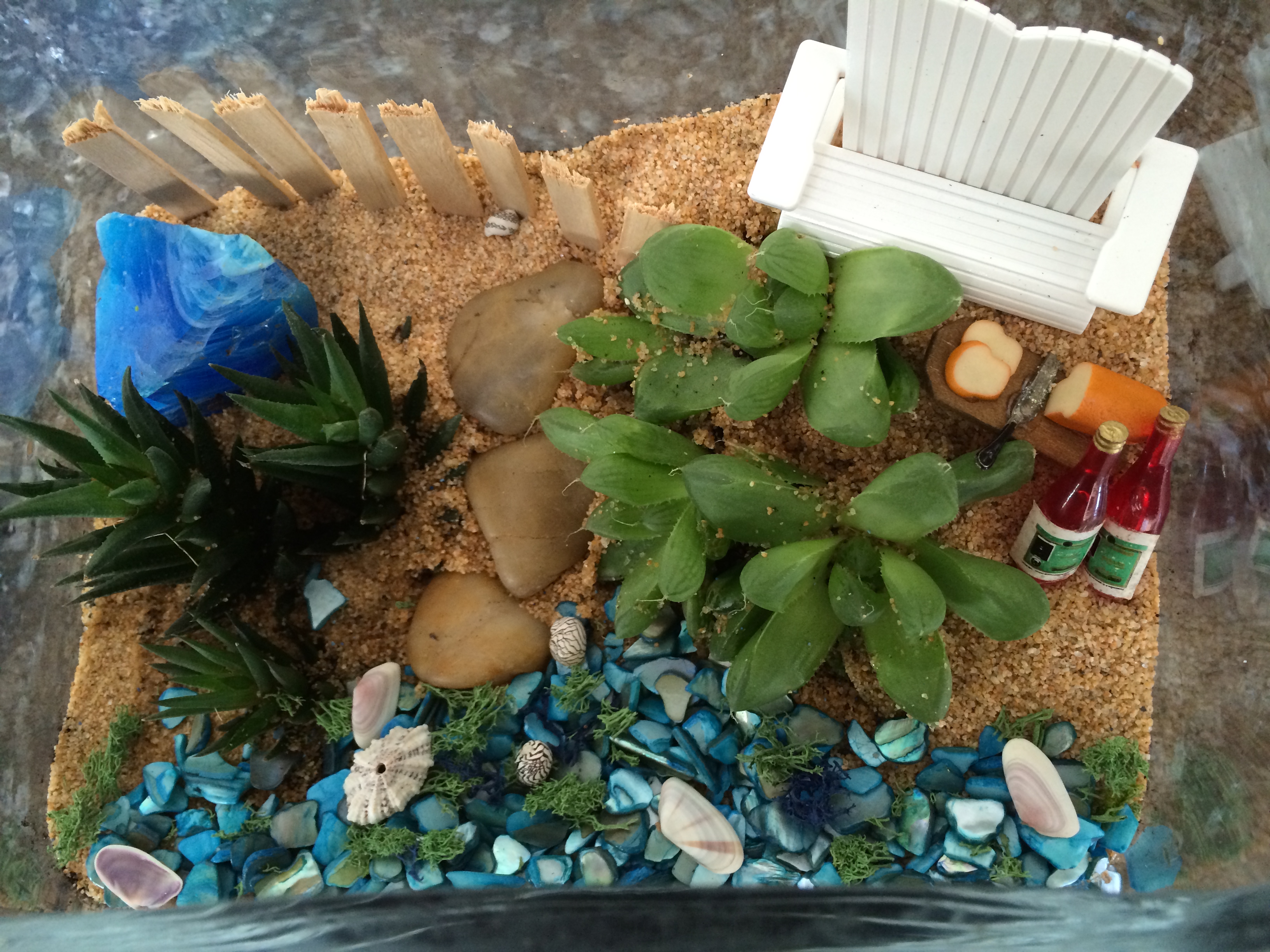 - Add tiny seashells and tiny tendrils of moss for seaweed to the water area