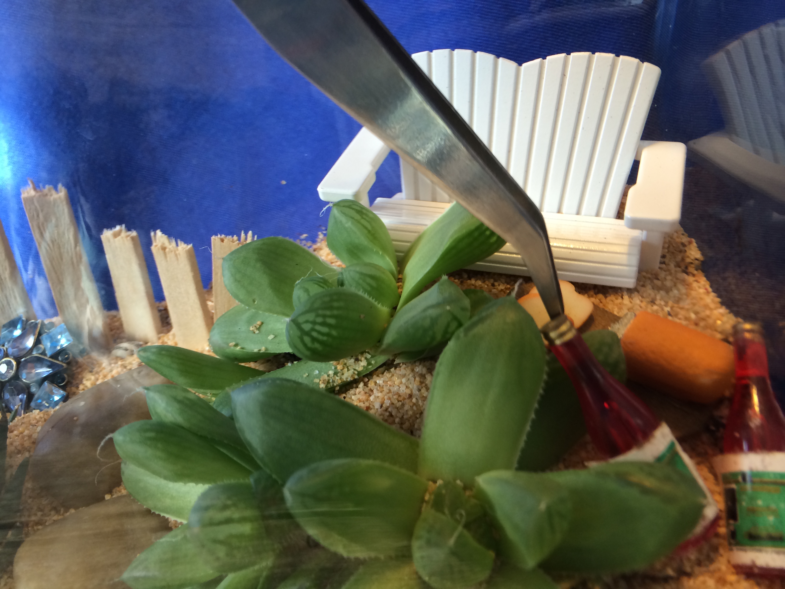 - Add the rest of your accessories; break popsicle sticks and stick in the sand for a fence, add your miniatures, using the tweezers